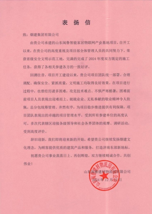 2024年12月12日,濟(jì)南公司承建的山東閩魯智能家居物聯(lián)網(wǎng)產(chǎn)業(yè)基地項目收到山東閩魯建材物流園有限公司發(fā)來的表揚(yáng)信。山東閩魯智能家居物聯(lián)網(wǎng)產(chǎn)業(yè)基地項目作為濟(jì)南市重點工程,深受各級領(lǐng)導(dǎo)和社會各界的關(guān)注,在公司領(lǐng)導(dǎo)大力支持和項目部全體人員共同努力下,圓滿完成了2024年度既定施工任務(wù),為建設(shè)單位展示良好品牌形象、提升區(qū)域市場影響力筑穩(wěn)了基礎(chǔ),獲得了各相關(guān)參建方的一致好評。